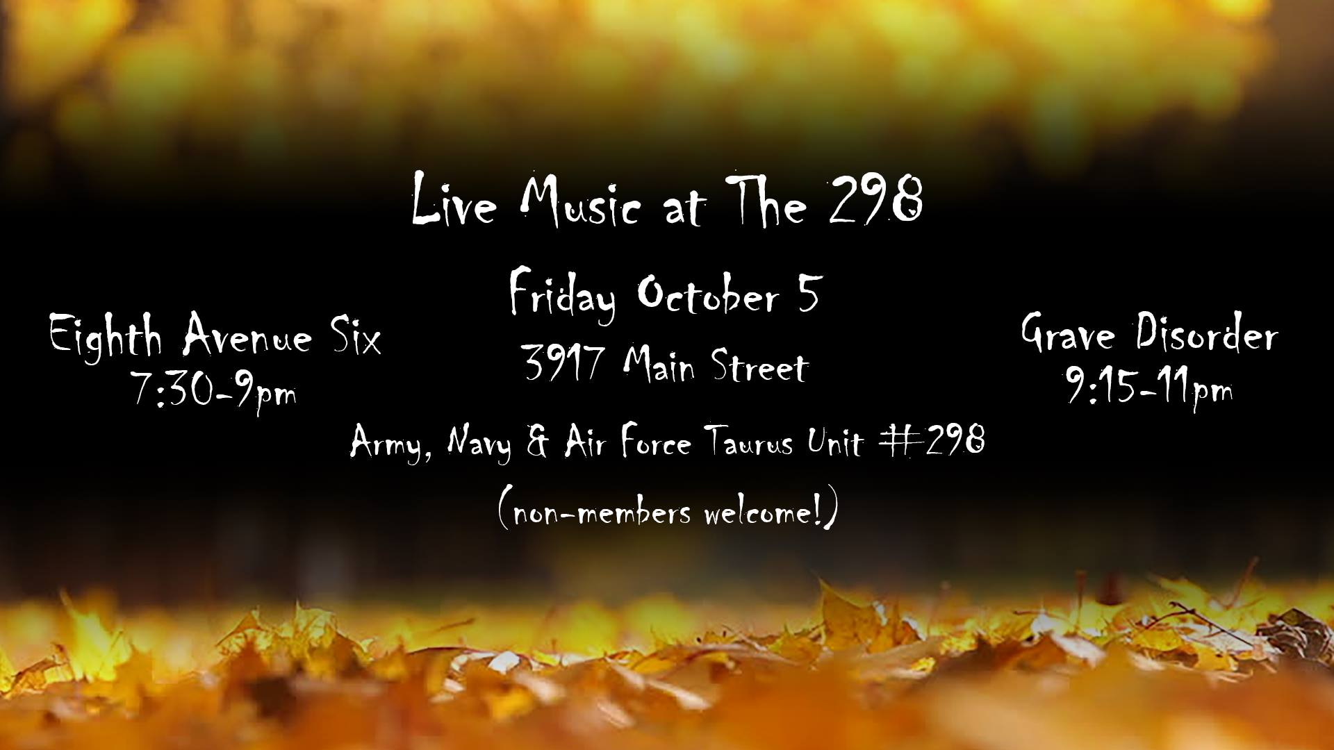 It’s tonight! Eighth Avenue Six & Grave disorder are ready to rock tonight, bringing you two sets of live music at the legendary Army, Navy & Air Force Taurus Unit #298. No cover! Just bring yourself, your dancin’ shoes, and some friends to share the good times with. See you at 7!